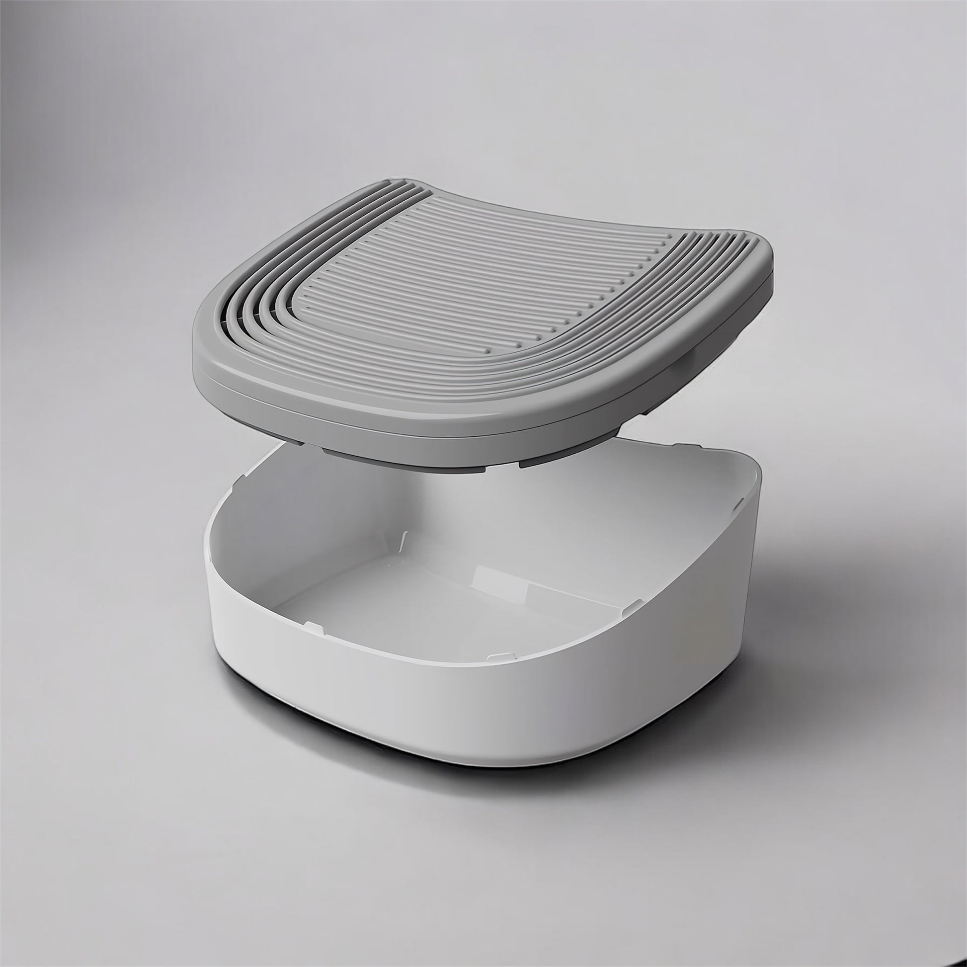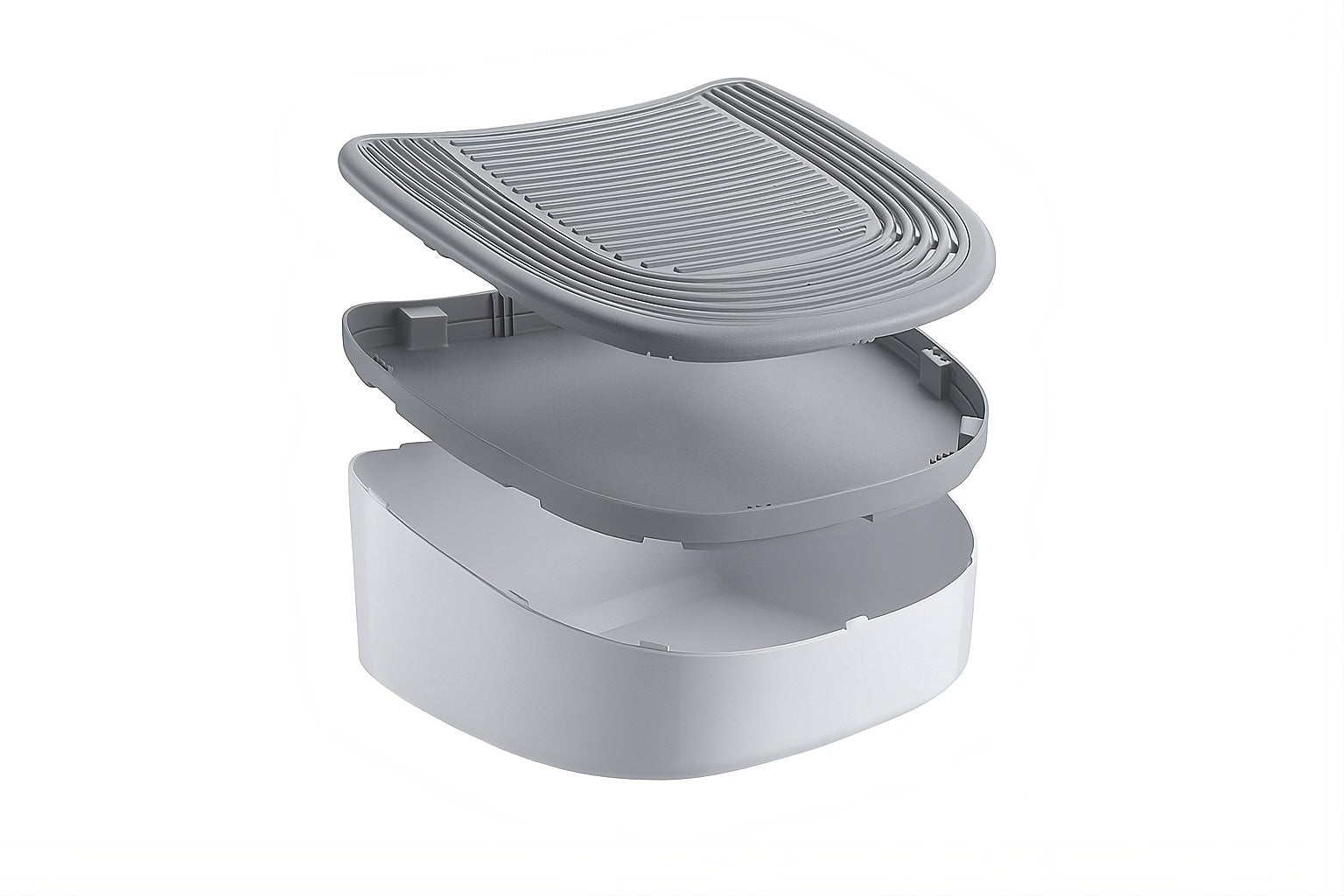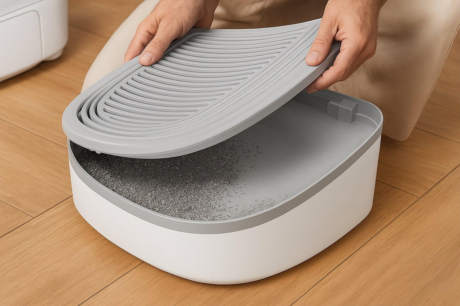Le plateau supérieur se soulève pour retirer la litière capturée. Un simple coup d'éponge humide suffit pour l'entretien régulier.
